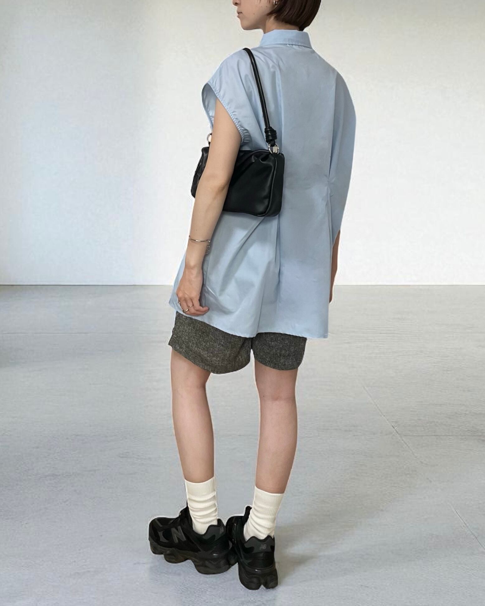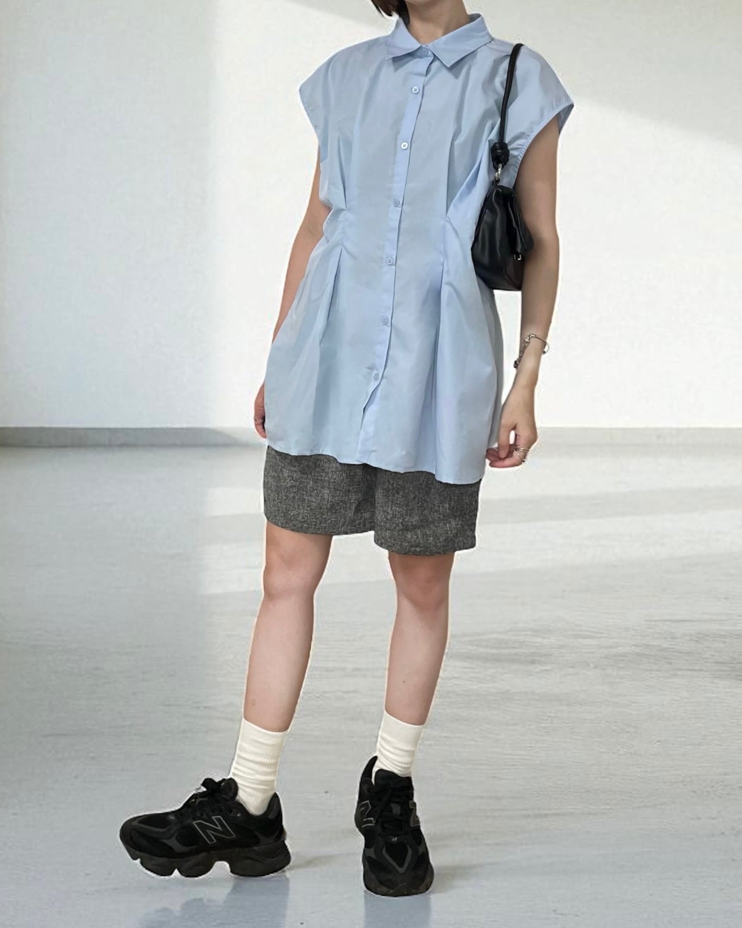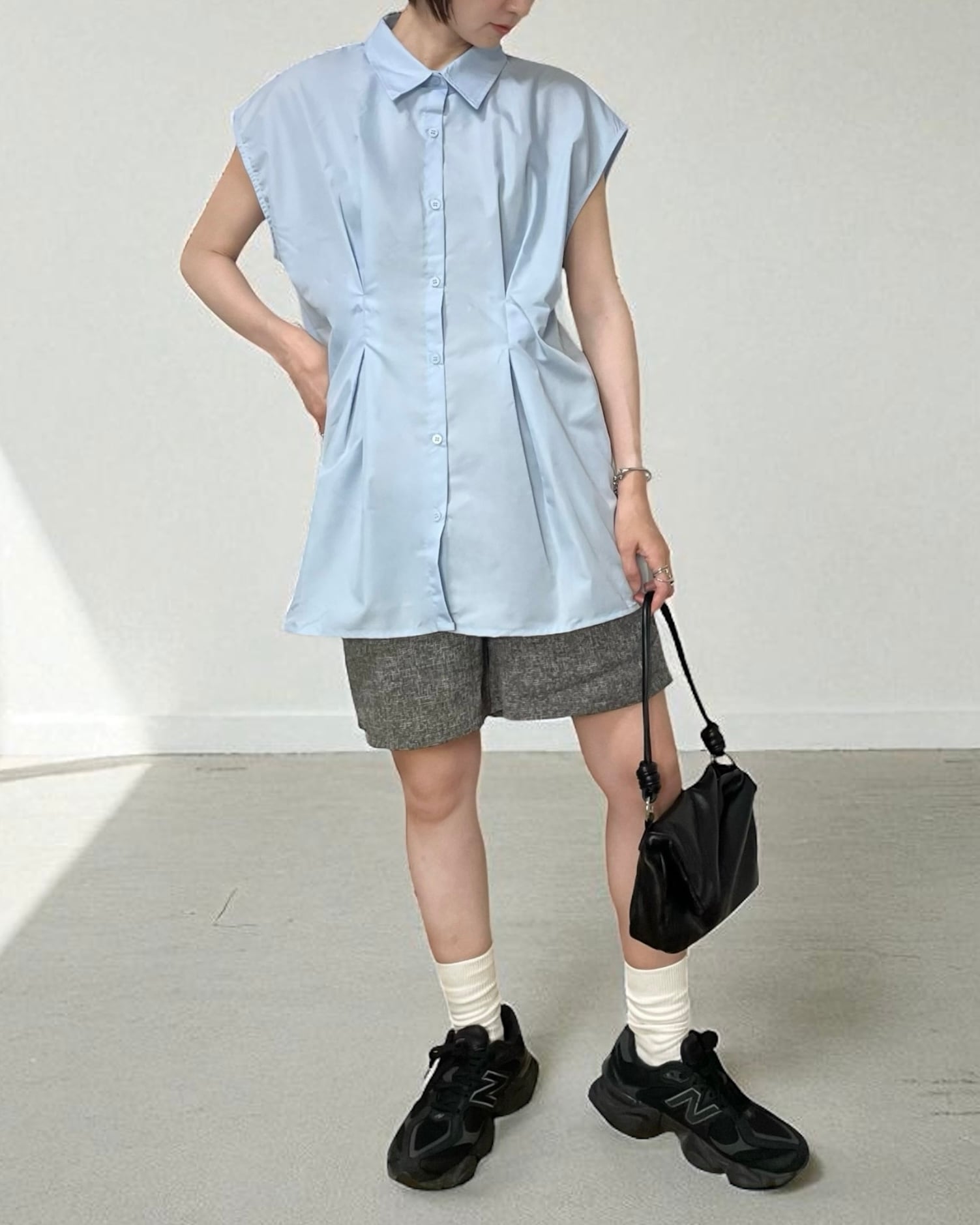ブロード生地のタックノースリーブシャツ