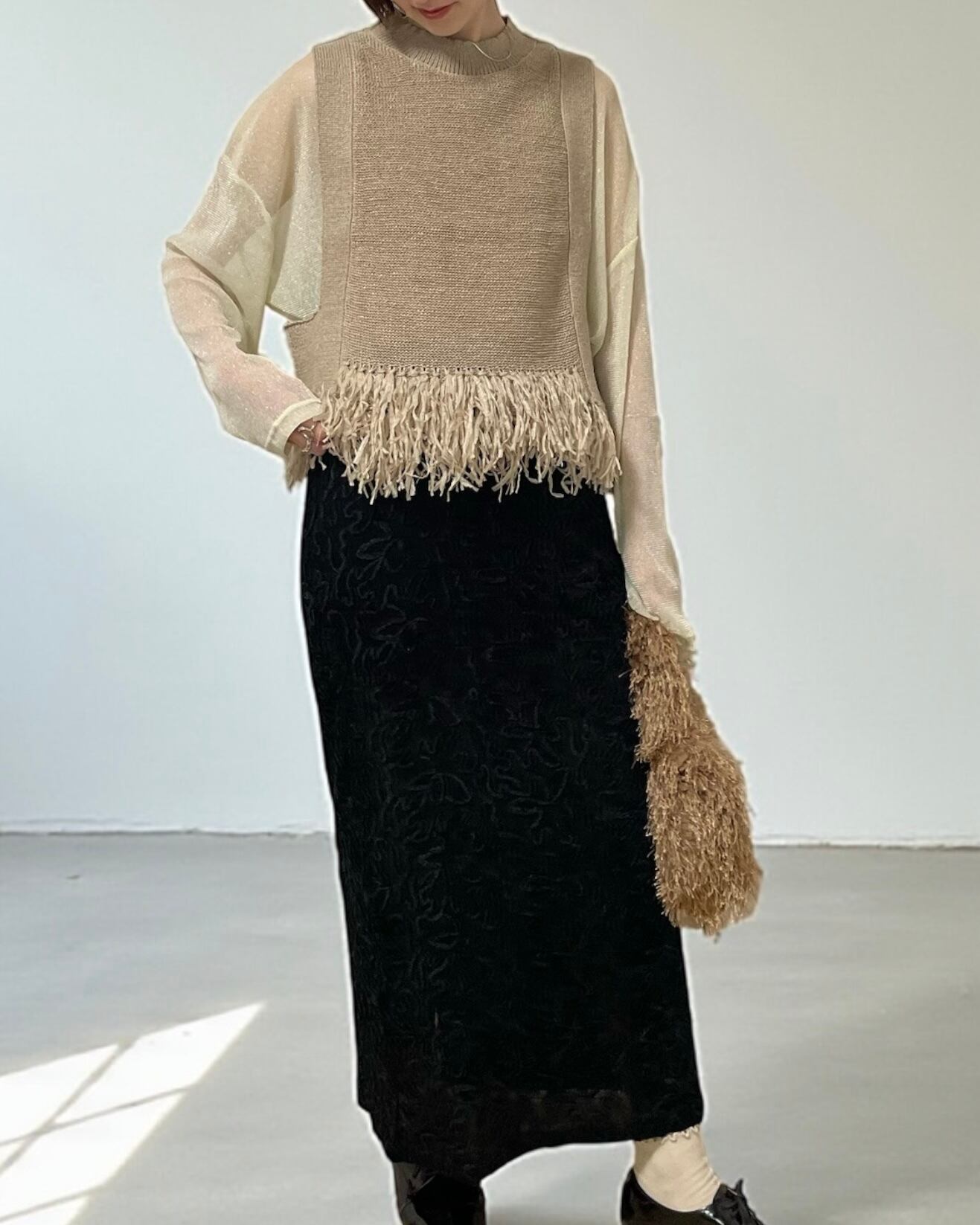 ベージュ・・フェザーヤーンニットベスト&コード刺繍ベロアスカート