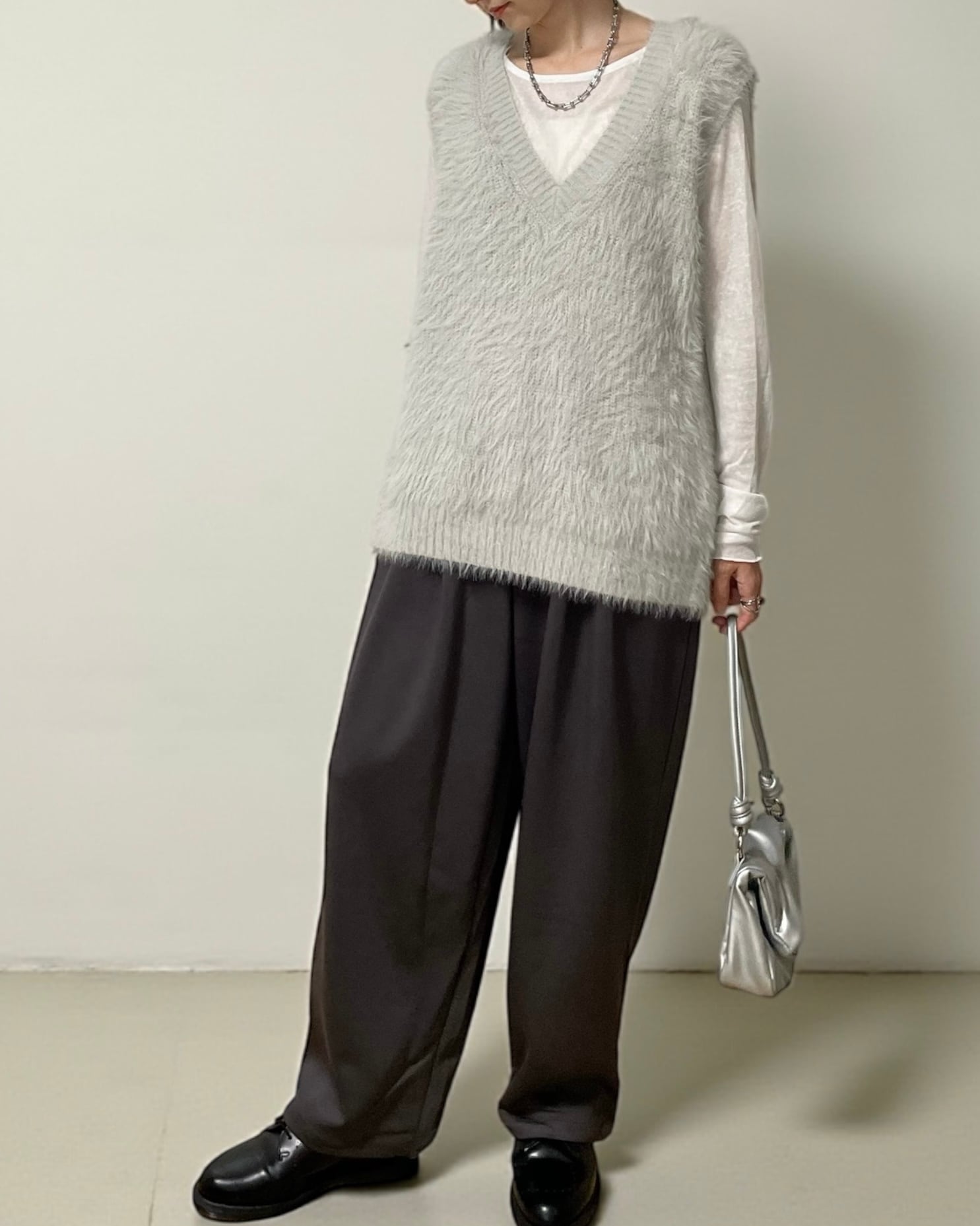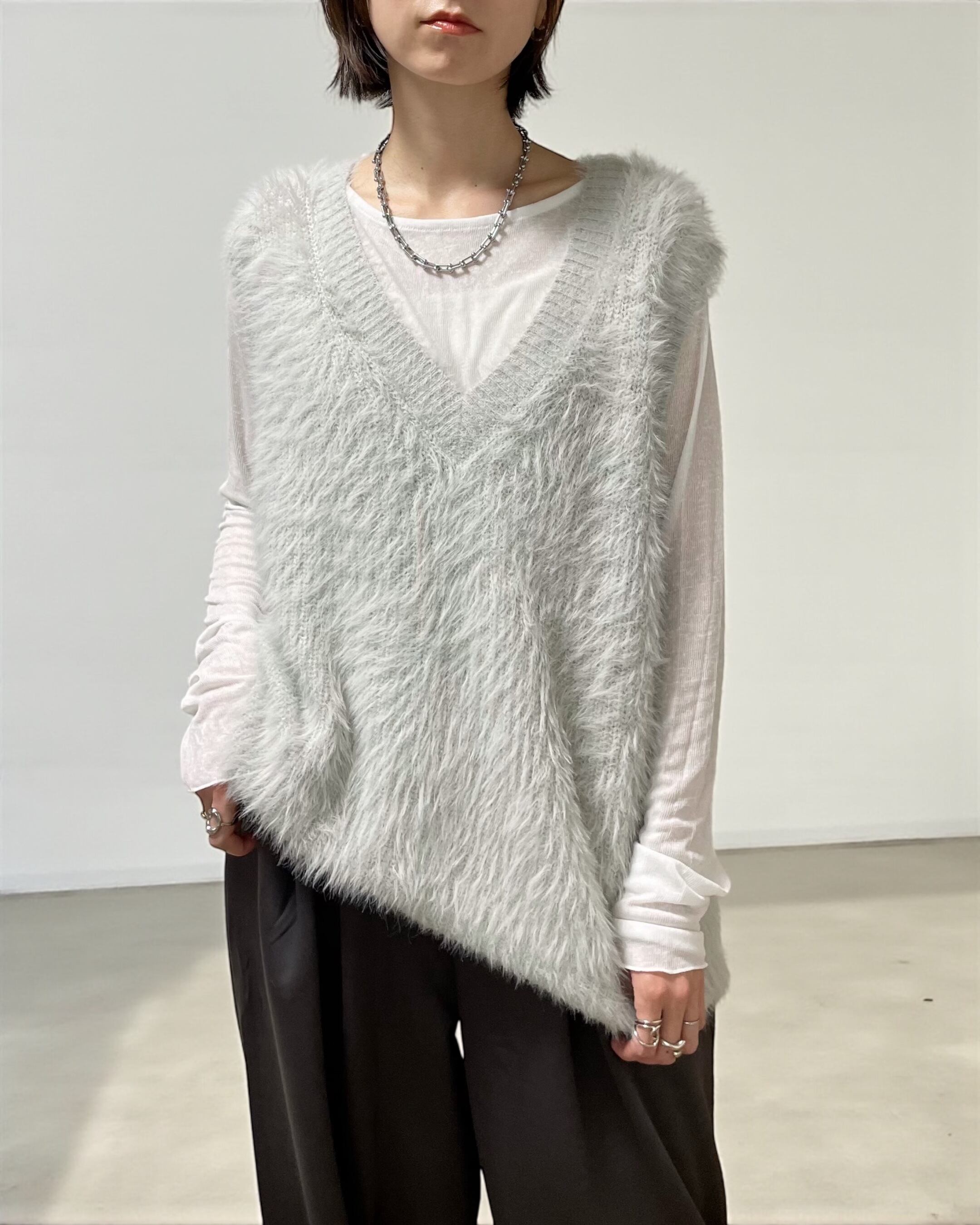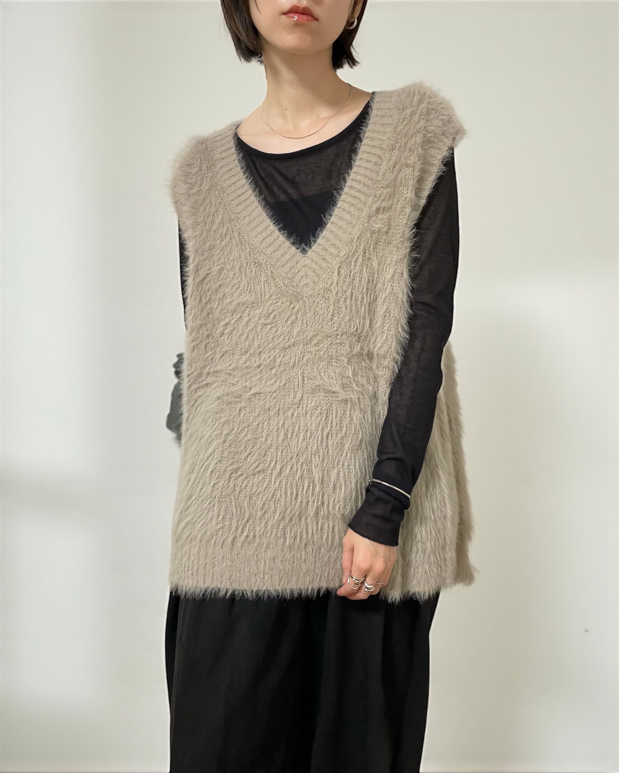 ルーズなオーバーサイズ感と、ふわふわもちもちのふんわりと毛足の長いシャギーが可愛い深Vネックのニットファーベスト。