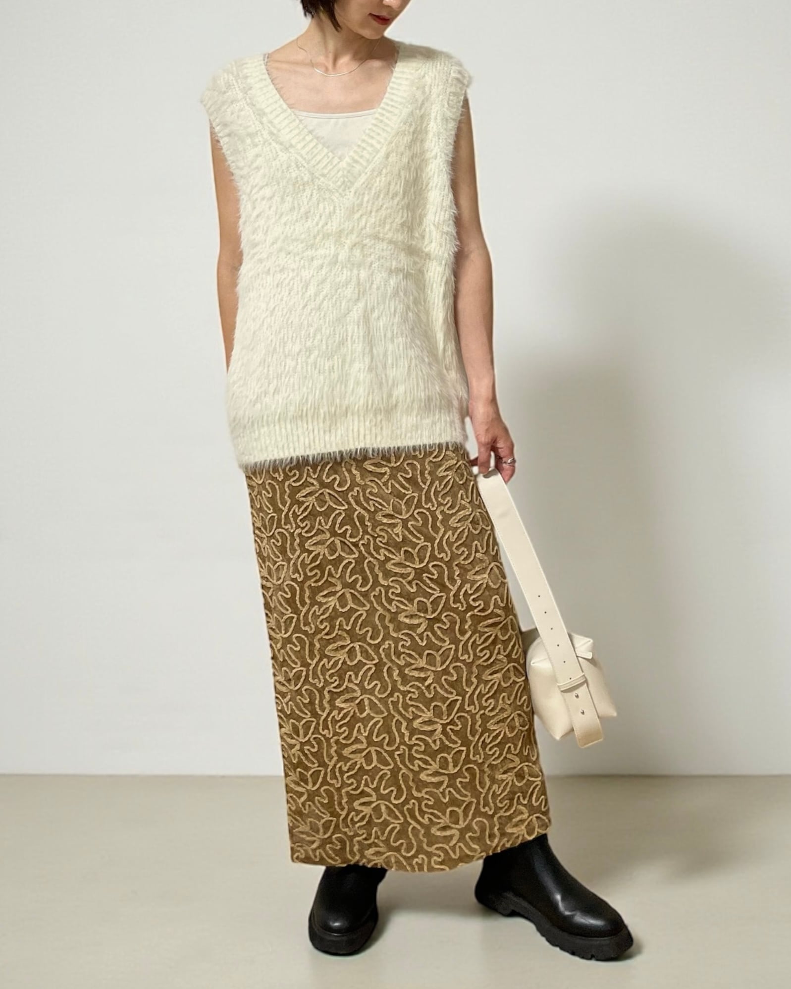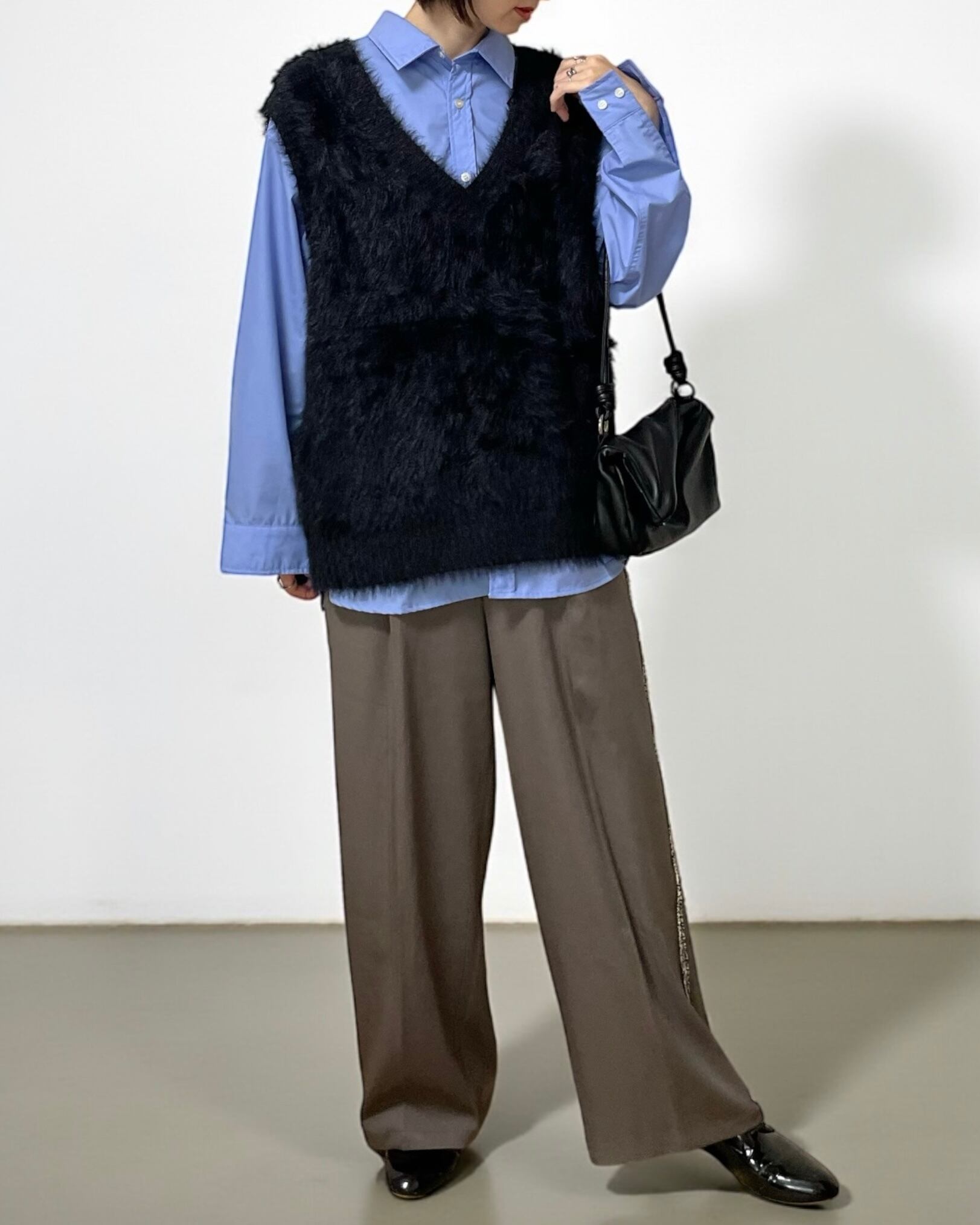 ふわっとしたシャギー素材がスタイリングを華やかにしてくれます。