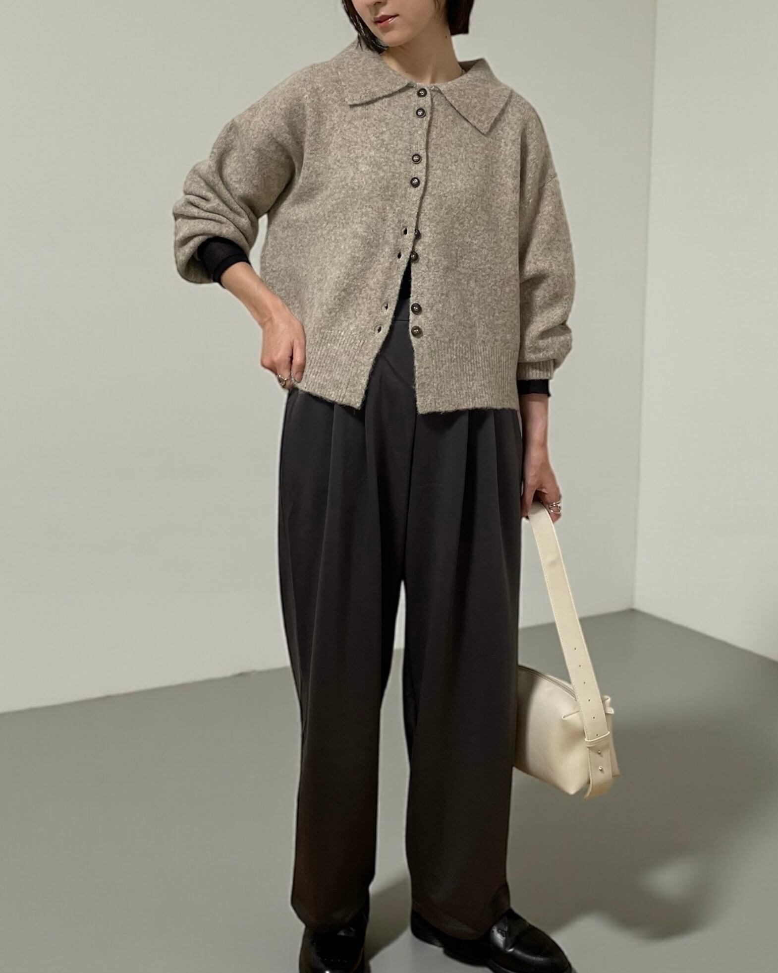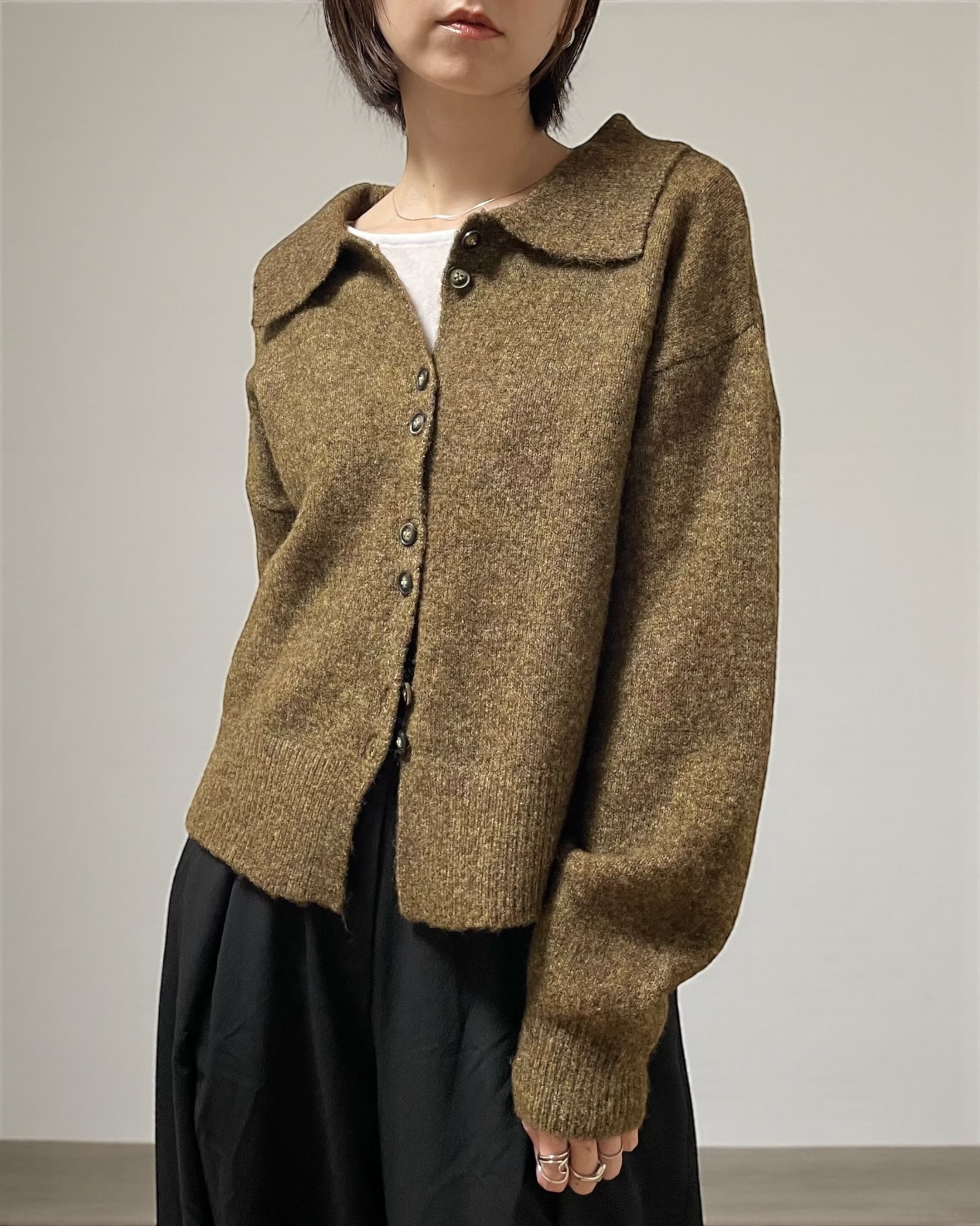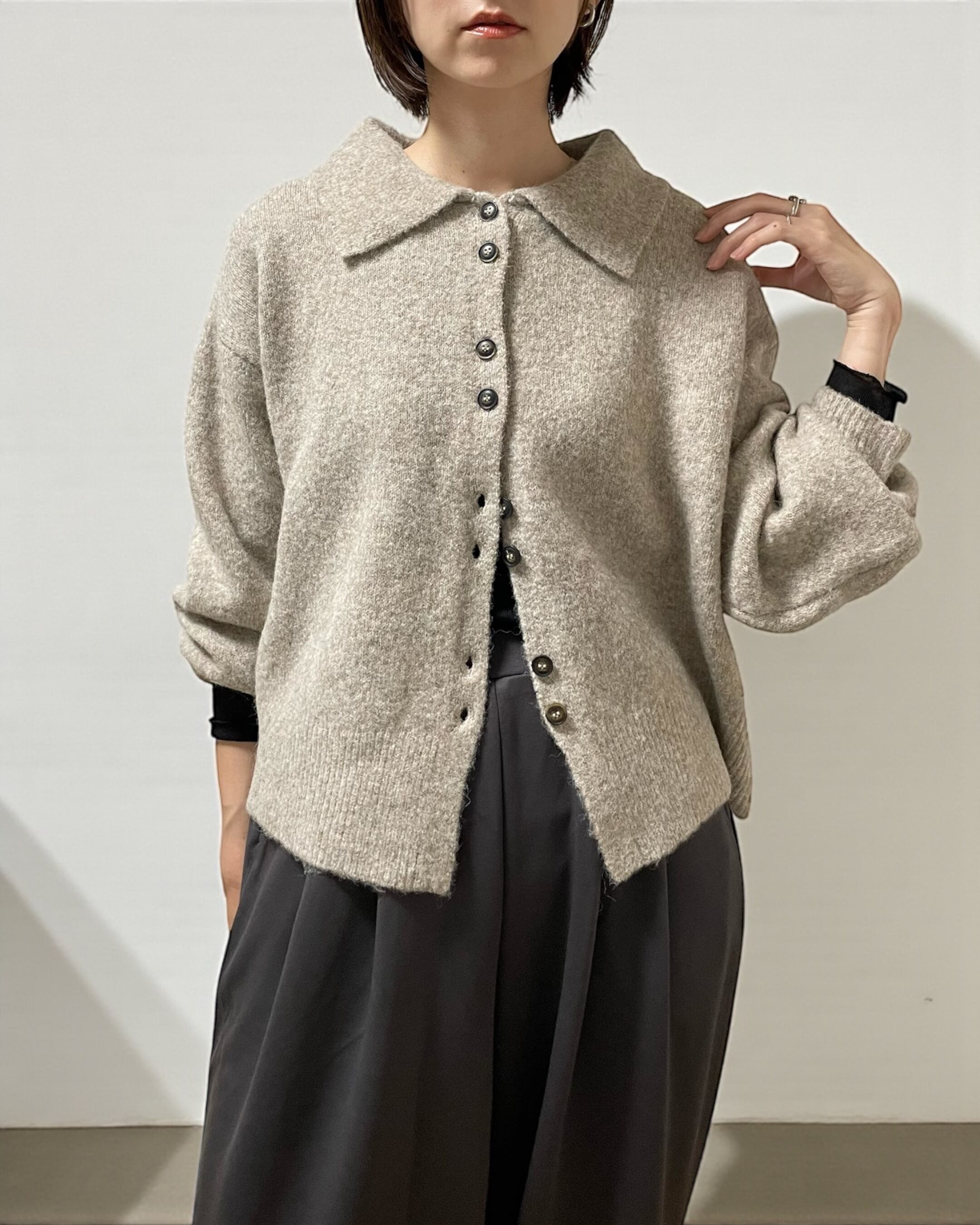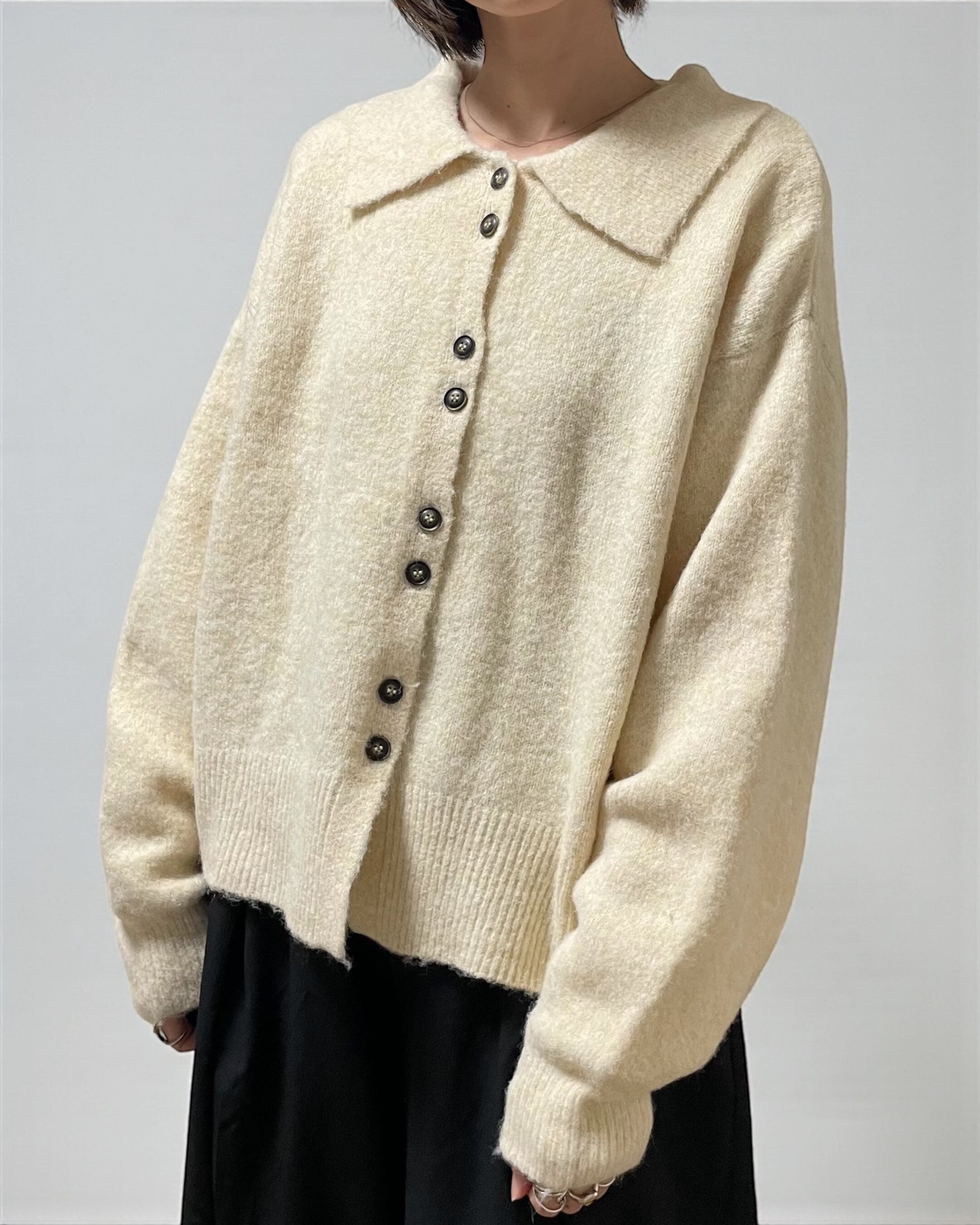 カーディガンとして羽織るのはもちろん、ボタンを閉めて襟付きニットとして着れば、一枚で主役級の存在感◎