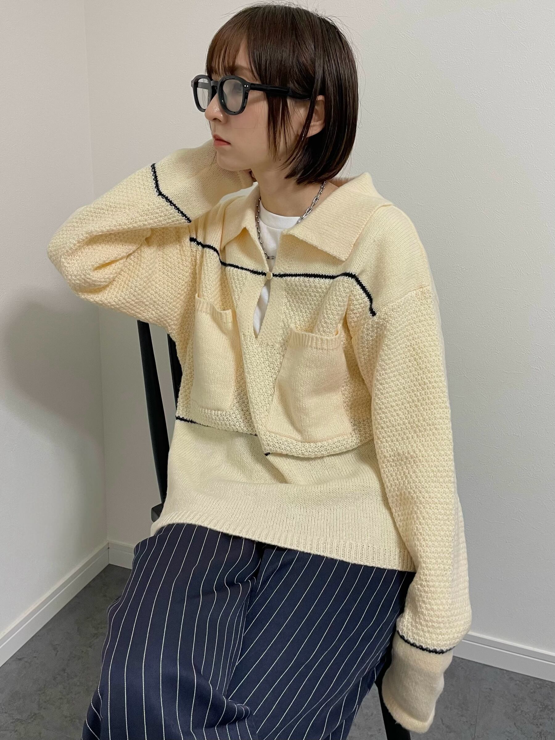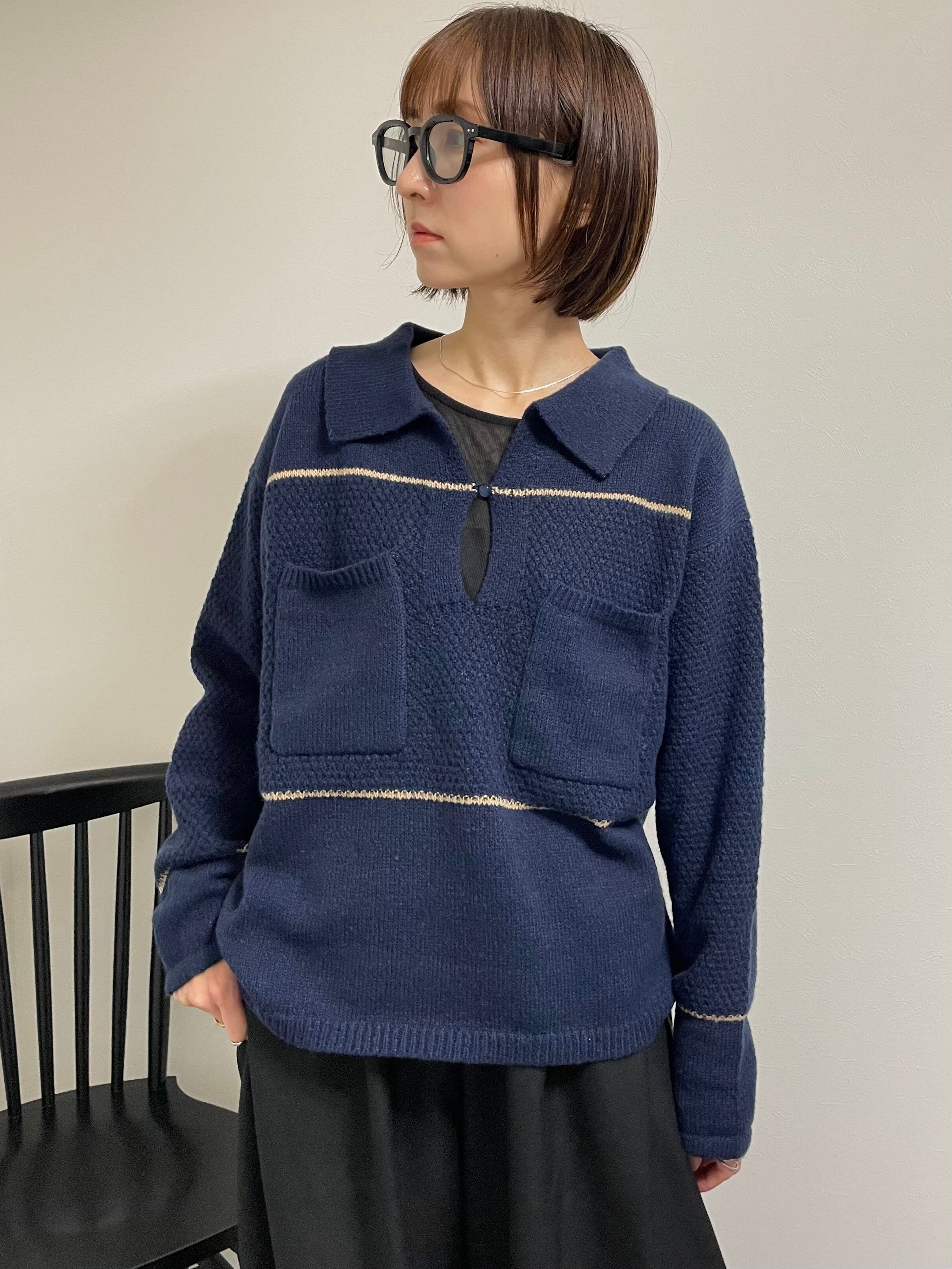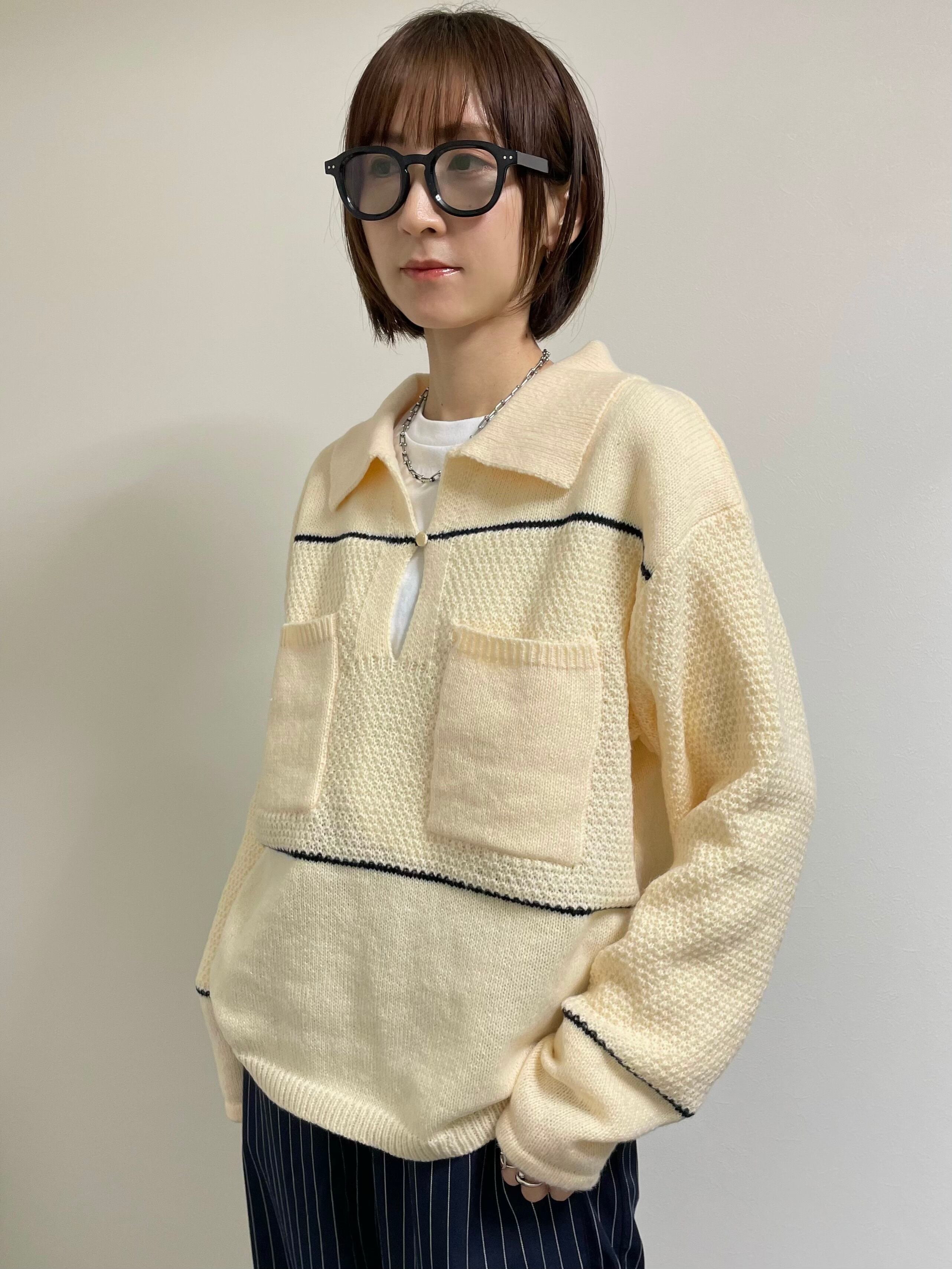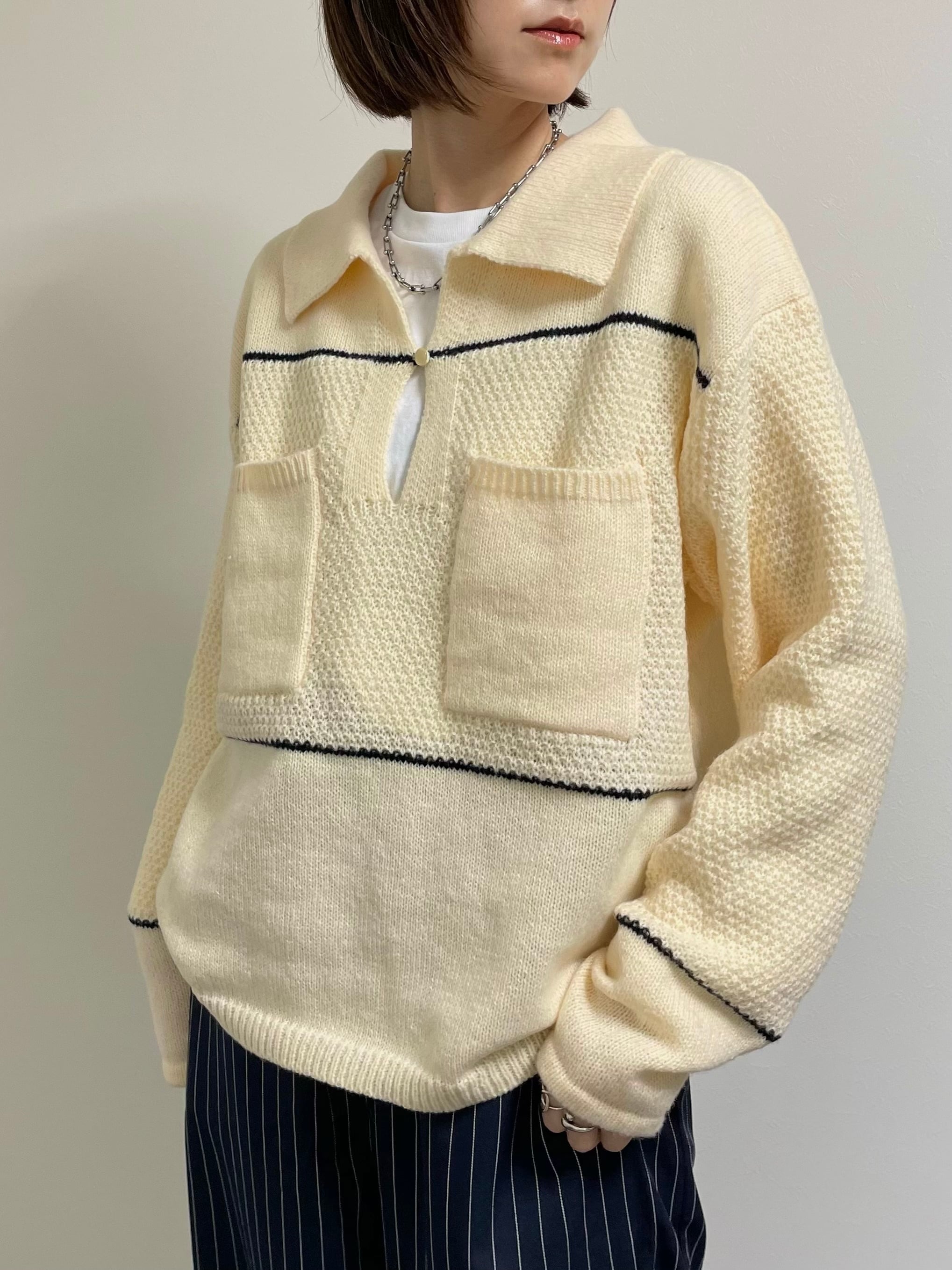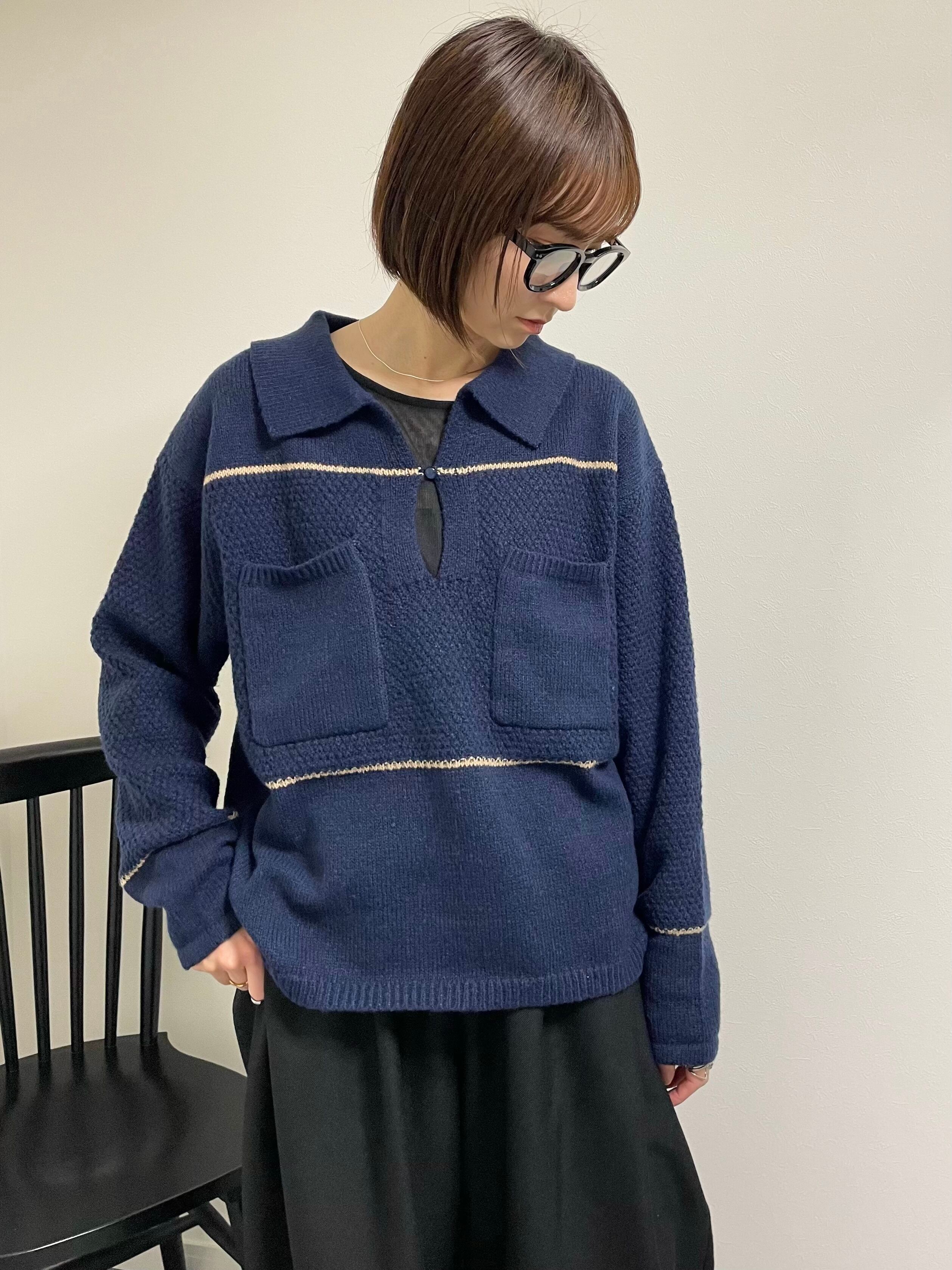 配色ラインとキーネックの抜けを効かせたポロ襟のニット。