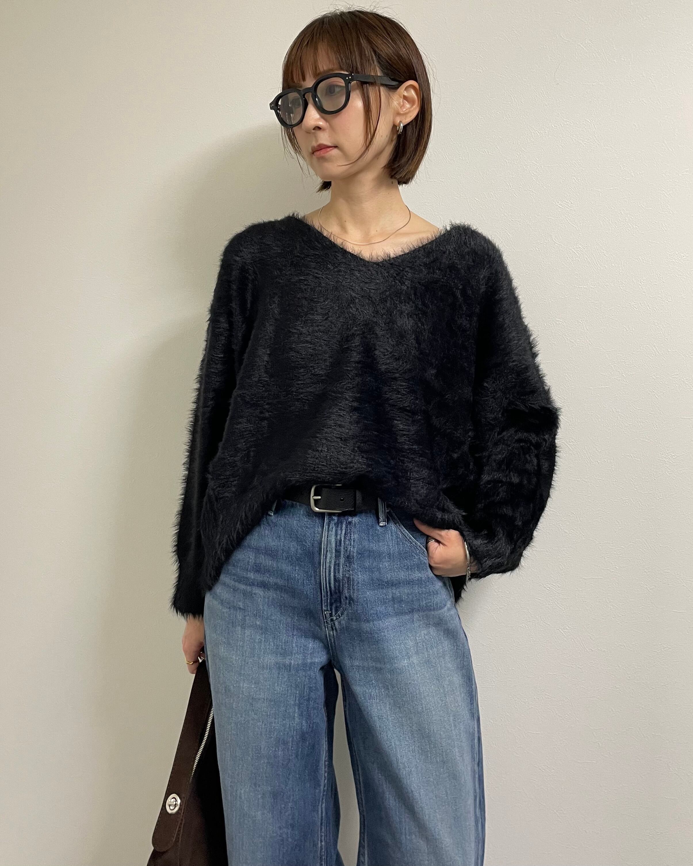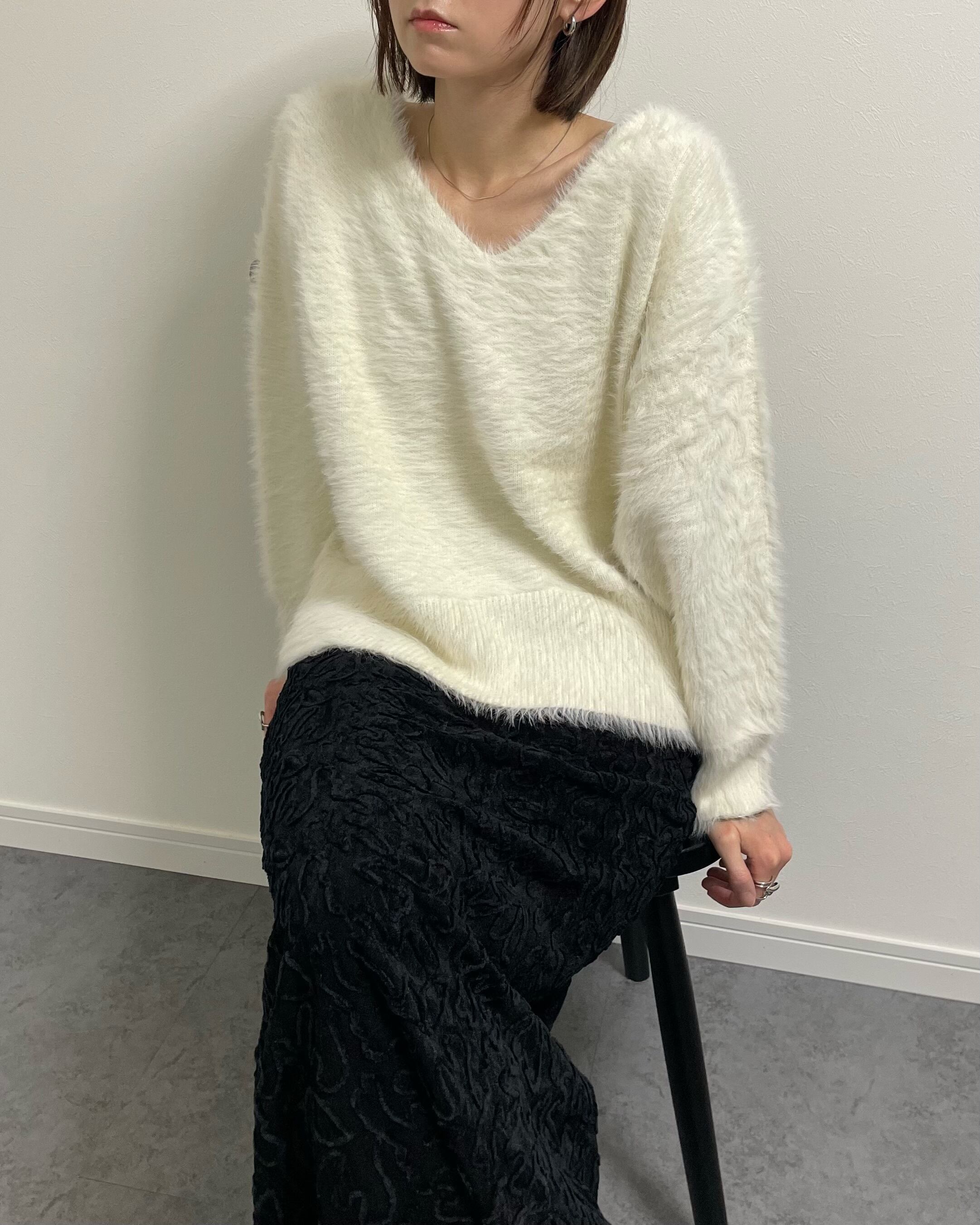 ふわふわとした毛足の長い毛糸を使ったバックリボンがポイントのシャギーニット。